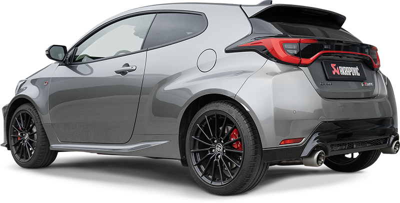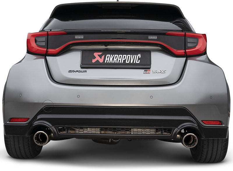 この排気システムは、レースで実績のある高品質チタンを全体に使用し、メガホン型のテールパイプを採用しています。リアレゾネーターの中央にあるコレクターは、自社鋳造工場で鋳造されています。このコレクターは、ガスの流れを最適化してバランスを取り、ドローン音のない音響的にチューニングされたサウンドを生み出します。コレクターの後ろに2つ、中央のパイプに1つの計3つのレゾネーターが、サウンド体験をさらにチューニングし、スポーティなレーシングトーンを作り出し、深く熱狂的なサウンドでエンジンの特性を最大限に引き出し、過剰な騒音に邪魔されることなく、乗員に爽快感を与えます。エンジニアは、中回転域と高回転域の音響に特に重点を置き、高回転域では高周波のトーン、アイドリング時と回転時にはより大きなサウンドを実現しています。このサウンドは、排気システムに溶接され、高温での色の変化を防ぐために特殊コーティングされた2つのメガホン型のチタン製テールパイプによって制御されます。テールパイプの形状はサウンドに影響を与えます。背圧を低減するために開発されたこのシステムは、重量6.8kgで、純正品より48.3%軽量化されています。アクラポビッチのダイナモメーターで、標準純正マフラーを装着したトヨタGRヤリスと比較テストした結果、6,950rpmで3.5kW(4.8hp)の出力向上と、6,950rpmで4.9Nmのトルク向上を実現しました。このマフラーは、サーキットおよびクローズドコースでの使用のみを想定して設計されています。ボルトオンで装着可能で、ECUのリマッピングは不要です。